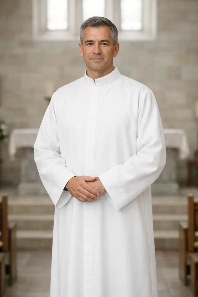 Optic-white and soft-ivory options remain consistent across all production runs. Color sits true beside albs, surplices, and white stoles.