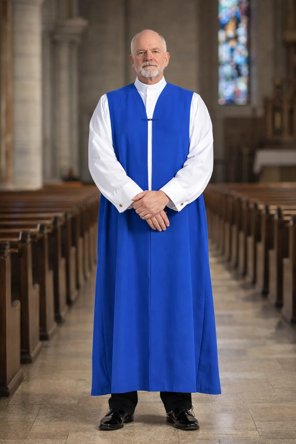 The garment is presented in royal blue, corresponding to Royal Blue (HEX #1F4FB2). This color is commonly used in Anglican and Episcopal traditions and remains visually consistent under church and sanctuary lighting.