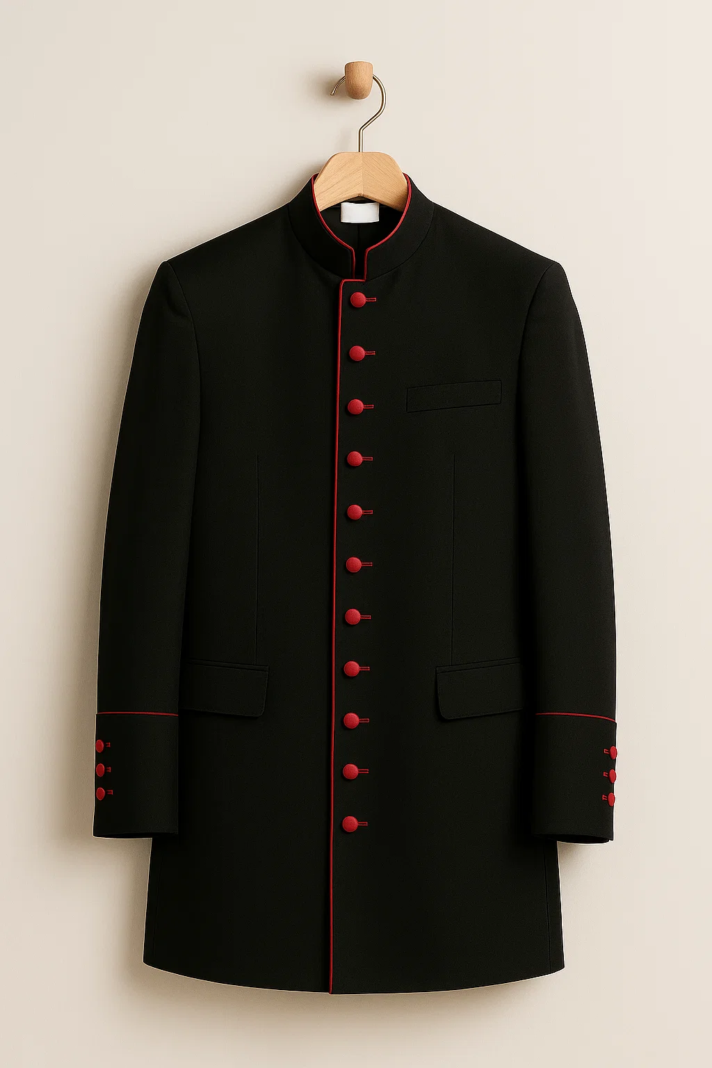 The Aureon men’s clergy jacket is a formal garment designed for clergy who seek a dignified appearance for high ceremonies, services, and special liturgical occasions. Crafted from a structured tropical fabric, this jacket offers durability while maintaining comfortable wear throughout the day. The striking black base is elevated by red piping along the collar, placket, cuffs, and back seam, adding distinction without overpowering traditional clerical style.