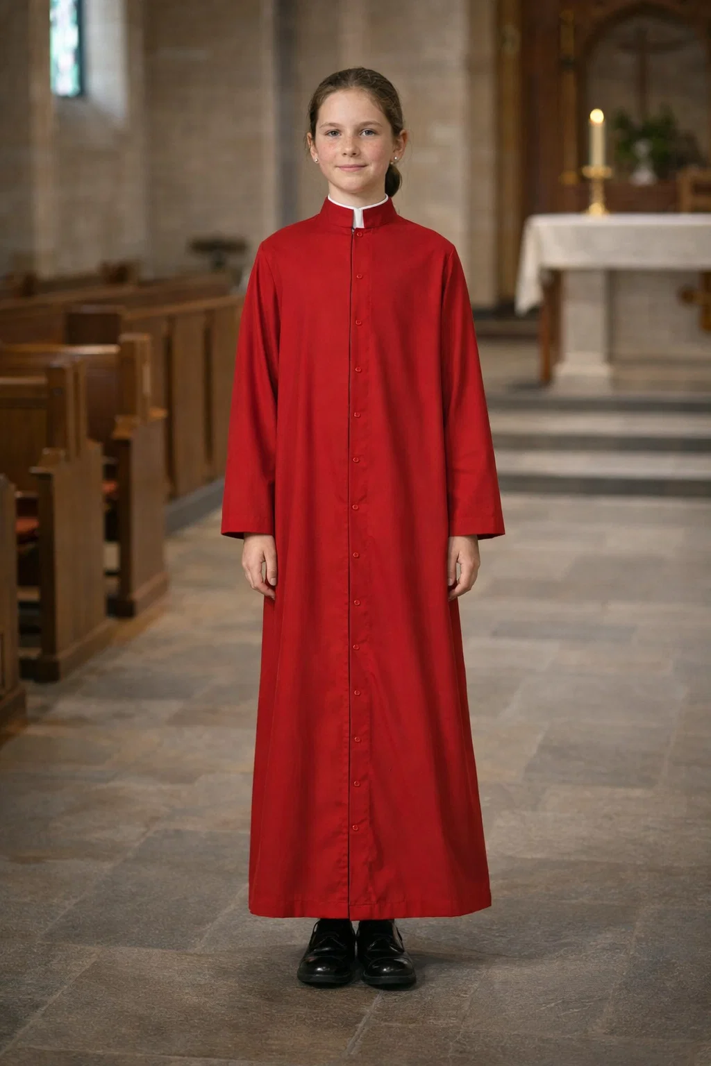 The straight silhouette allows natural movement while preserving modesty and correct cassock shape. Sleeves are proportioned specifically for youth, preventing excess fabric while allowing comfortable gesture during service. The hemline includes internal reinforcement to add subtle weight, helping the garment fall evenly and remain centered.