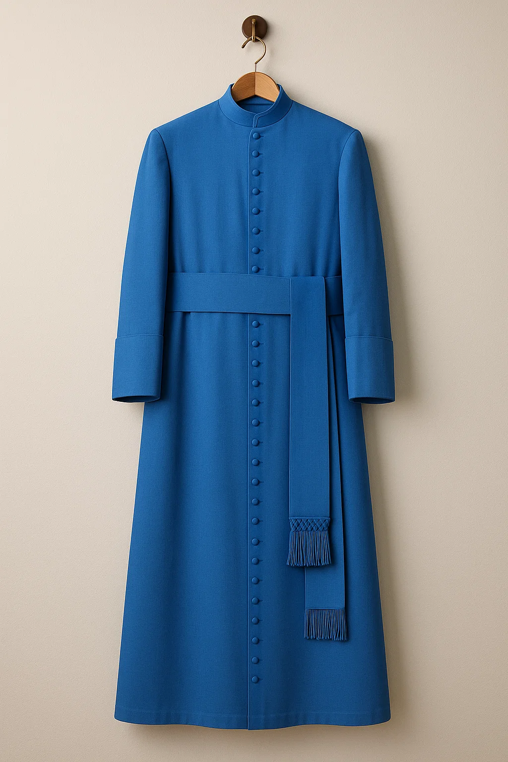 - Tradition: Fringed sash and full buttons emphasize clerical symbolism.