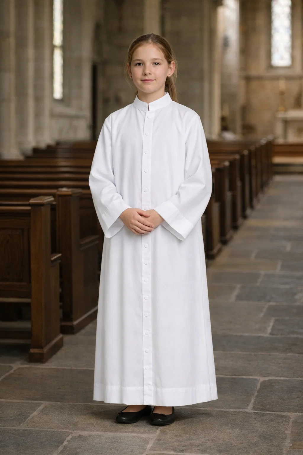 Proportions are adjusted for young altar servers to ensure correct sleeve and body length.