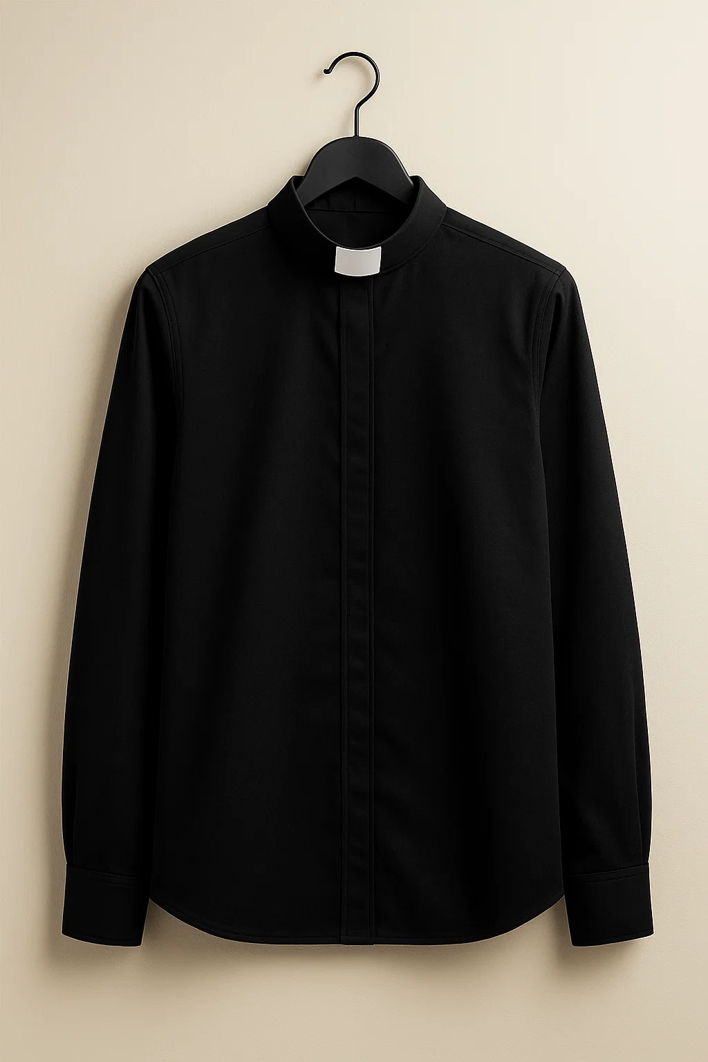 - Collar style: Stand-up white tab collar offering a classic clerical look.