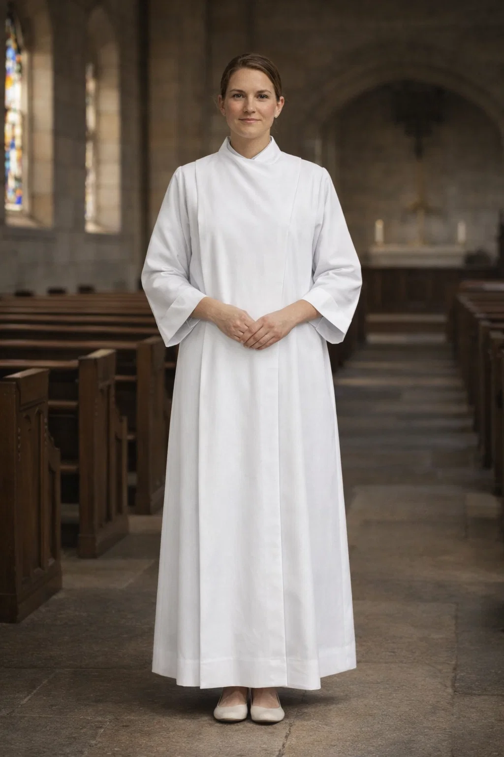 This alb is suited for clergywomen, deaconesses, altar ministers, and liturgical assistants who require a dependable, properly structured garment designed specifically for female fit and regular ceremonial use.